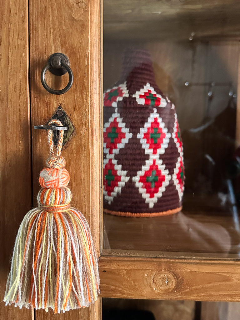 Dit handgemaakte sleutelhanger-ornament is zacht, eenvoudig en perfect in balans. De warme tinten honing, saffraan en taupe geven die typische Marokkaanse uitstraling.