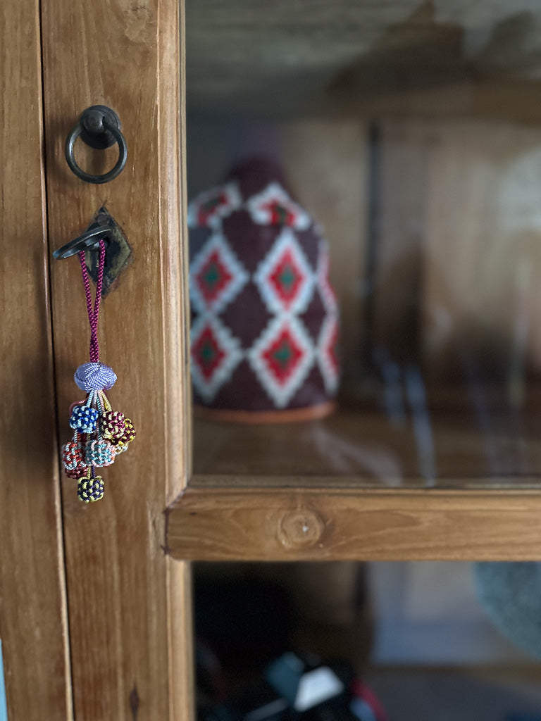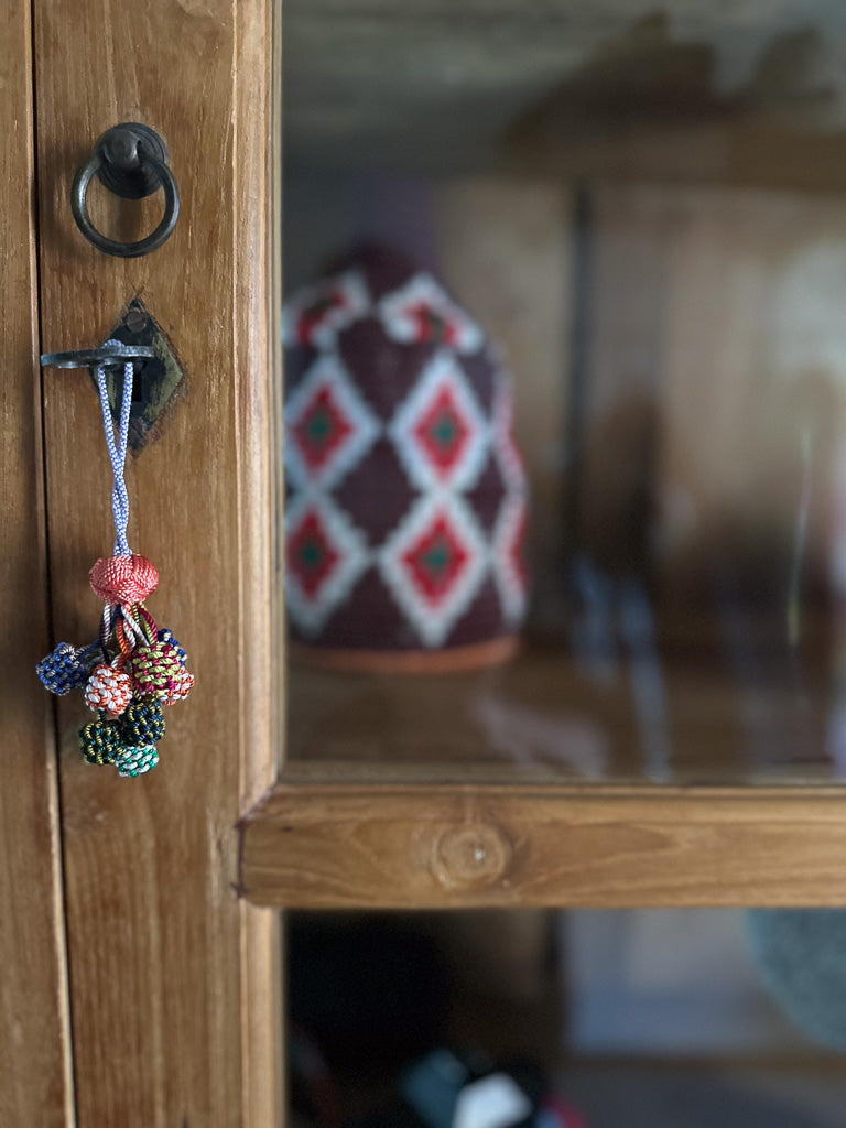 Handgemaakte knoop-sleutelhanger, ze bestaan uit traditionele, met de hand geknoopte knopen die oorspronkelijk worden gebruikt op de djellaba – een klassiek Marokkaans kledingstuk. Het maken van deze knopen is een verfijnd en tijdrovend ambacht dat veel precisie en ervaring vereist. Vrouwen leren deze techniek vaak al op jonge leeftijd, van hun moeder of grootmoeder.